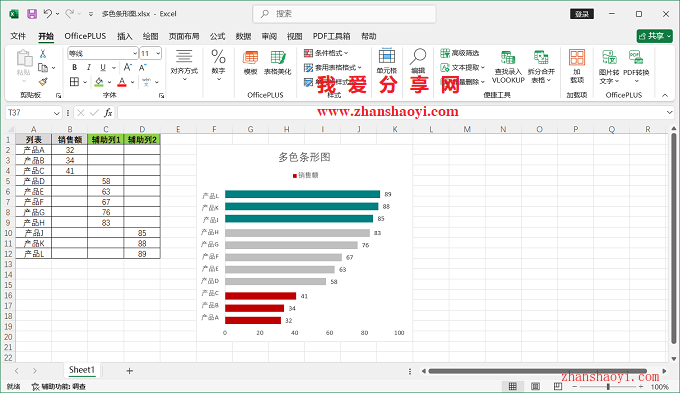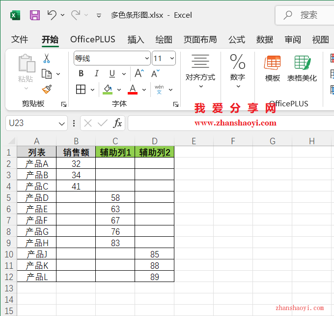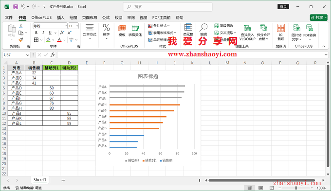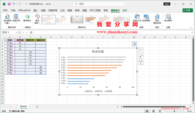 2、第一步,调整数据源,把数据拆分成3个列,这里将销量最多和最少3个产品放在同一列,目的是重点突出展示销量最多和最少的系列数据,弱化其它系列,指向性目的更强,注:需要几种颜色分阶就要拆分为几列;