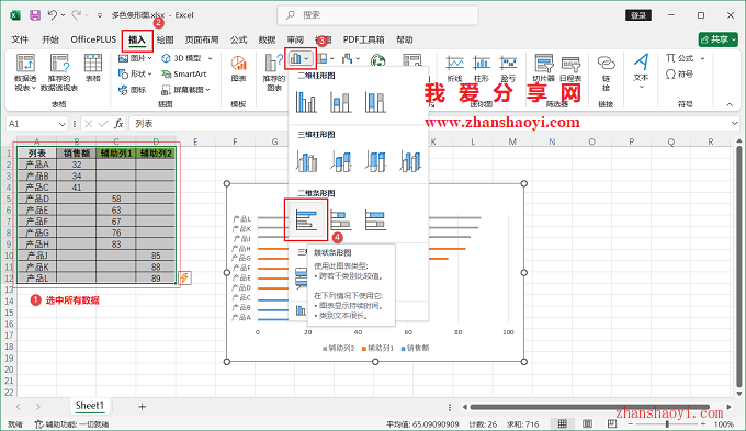 3、选中所有数据,点击上方菜单栏【插入】,再点击图表栏中【柱形图】按钮,在展开列表中选择【簇状条形图】;