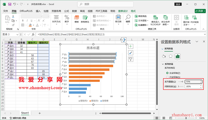 7、先将间隙宽度设置为0%,然后将系列重叠设置为70%,根据实际合理调整;