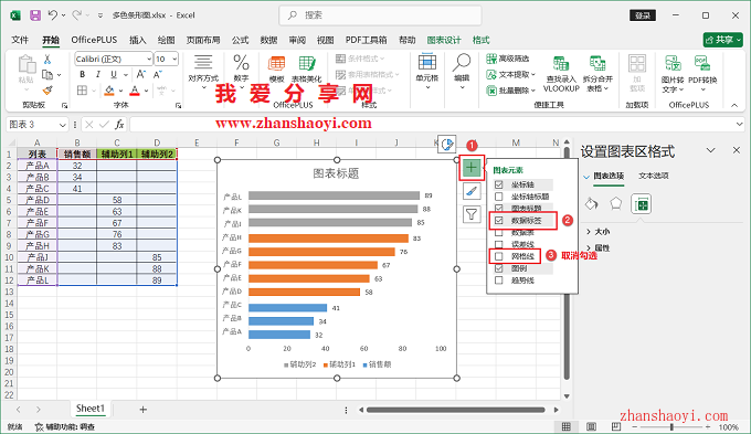8、第四步,添加数据标签,点击图表右上角【+】按钮,勾选【数据标签】,再取消【网格线】选项前的勾选;