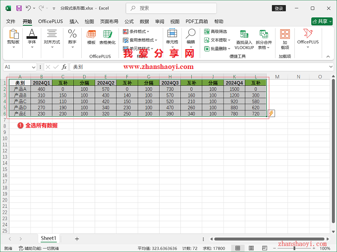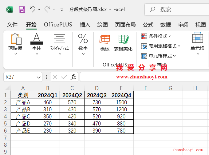 1、先打开Excel 2024软件,然后在单元格中输入示例数据,为目公司季度不同产品销量统计表;