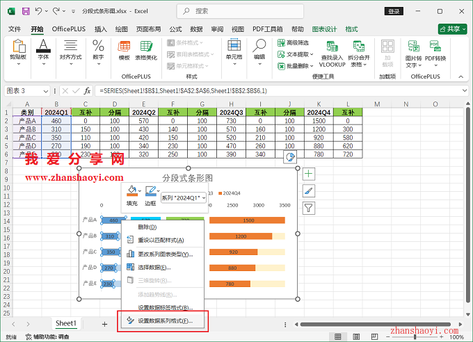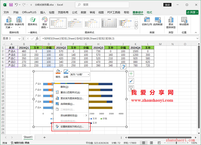 7、第四步,隐藏分隔系列,鼠标右击分隔系列条形选择【设置数据系列格式】;