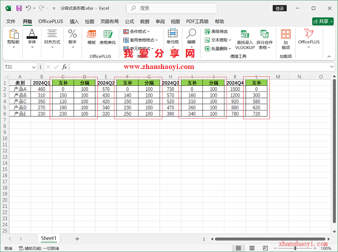 2、第一步,调整数据源,在每列数据中间插入「互补列+分隔列」,最后一列后增加「互补列」,其中互补列数据等于前一列数据最大值减去前一列;分隔列为固定值,可根据实际合理调整;