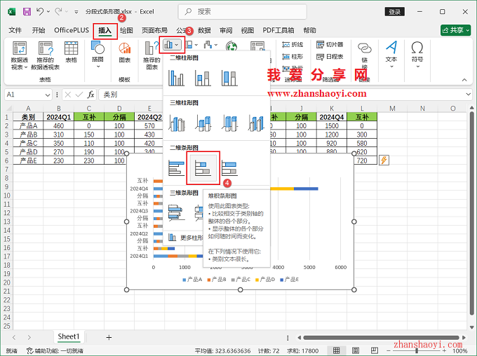 4、默认插如的堆积条形图如下,但这并不是我们想要的;