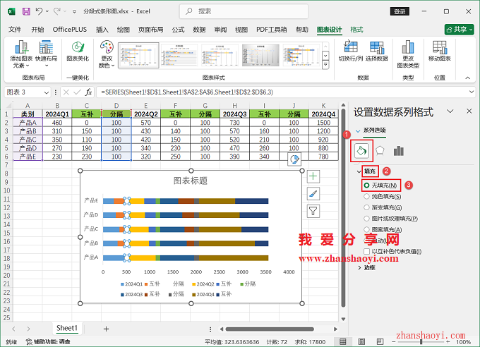 8、勾选【无填充】,类似,隐藏其他两个分隔系列条形;