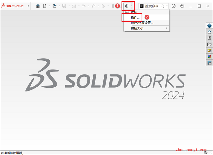 1、先打开SolidWorks 2024软件,点击软件上方的【齿轮】按钮→【插件】;