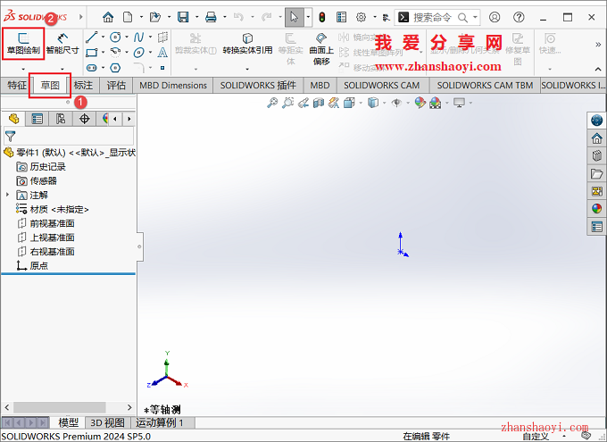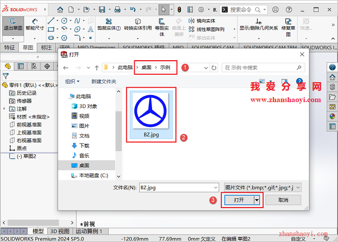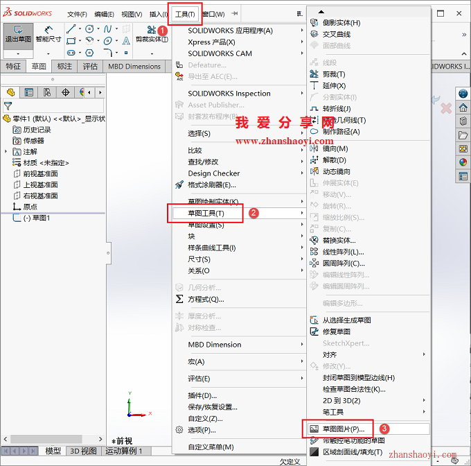 5、将鼠标放到界面左上角的SOLIDWORKS图标处,点击菜单栏中【工具】→【草图工具】→【草图图片】;