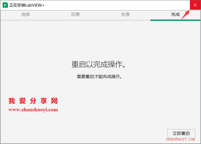 11、安装完成,点击界面右上角【×】关闭,暂不重启电脑;
