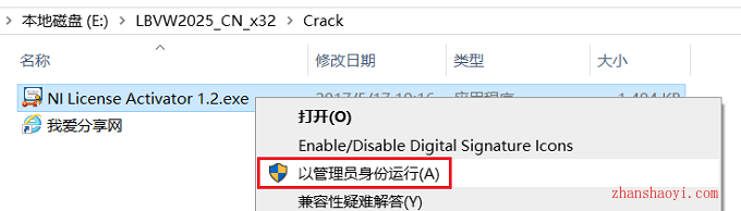 13、然后找到NI License Activator 1.2.exe,鼠标右击选择【以管理员身份运行】,注意:一定要以管理员身份运行,否则会安装失败;