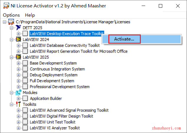 14、找到LabVIEW Desktop Eexcution Trace Toolkit,鼠标右击弹出【Activate】按钮,点击它将前面的小框由灰变绿;