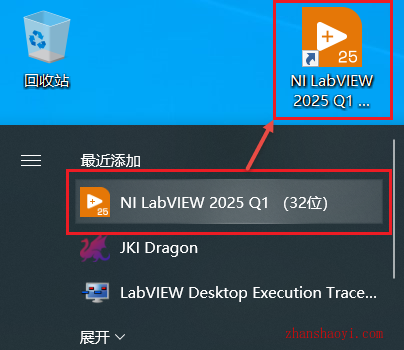 16、点击左下角【开始】按钮在弹出的程序列表中找到NI LabVIEW 2025 Q1(32位),鼠标左键按住不放直接拖拽至电脑桌面,生成电脑桌面软件图标;