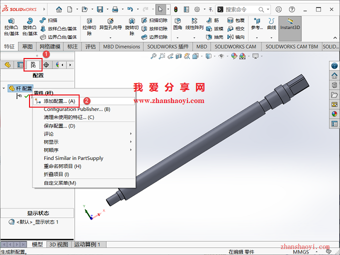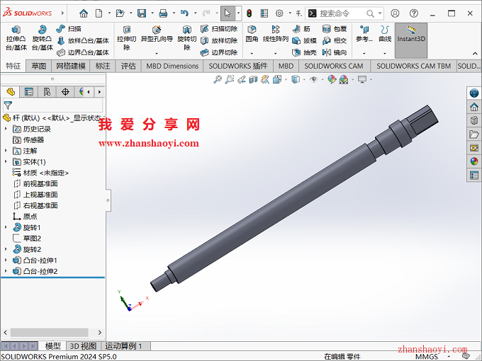 1、先打开SolidWorks 2024软件,然后打开如下杆类零件;