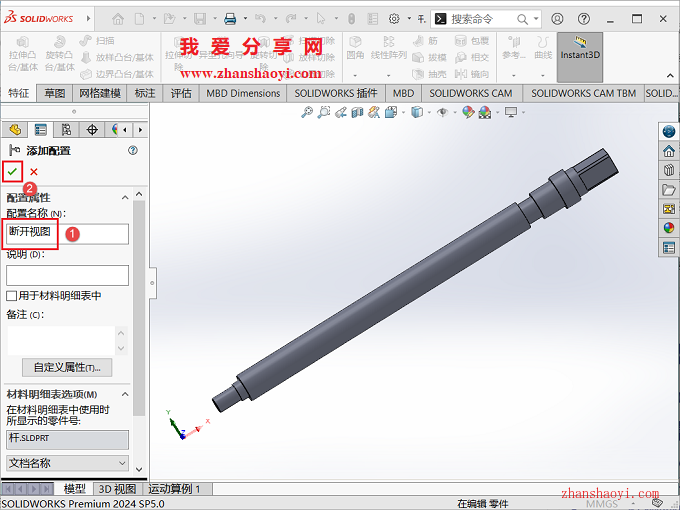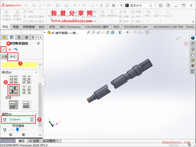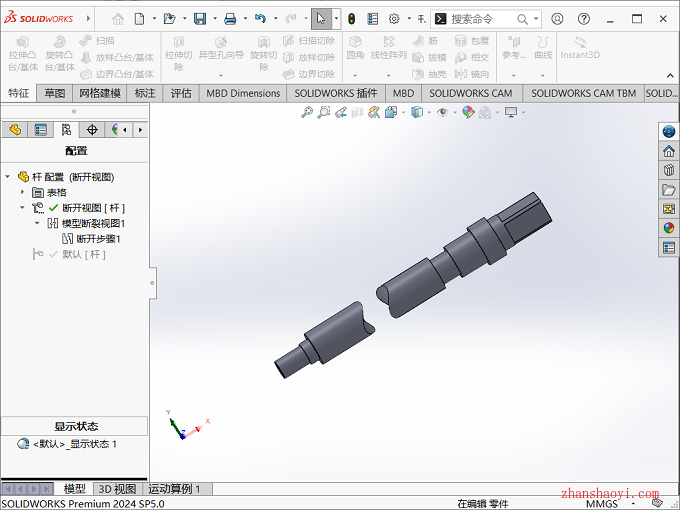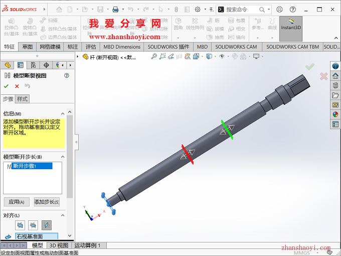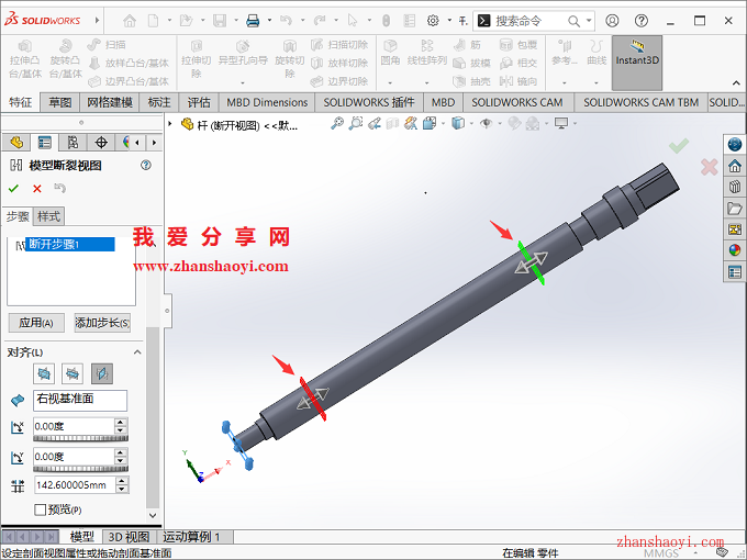 SolidWorks工程图中断开的视图很多小伙伴都很熟悉,其实SolidWorks还可绘制出三维模型断开视图,比如一根轴太长,我们可以把模型中相同的地方截短,这样可以在软件窗口中以更好的比例展示我们的模型,图纸细节表达更清晰;