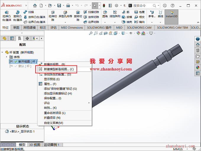 4、在左侧栏中断开视图[杆]上鼠标右击选择【新建模型断开视图】;