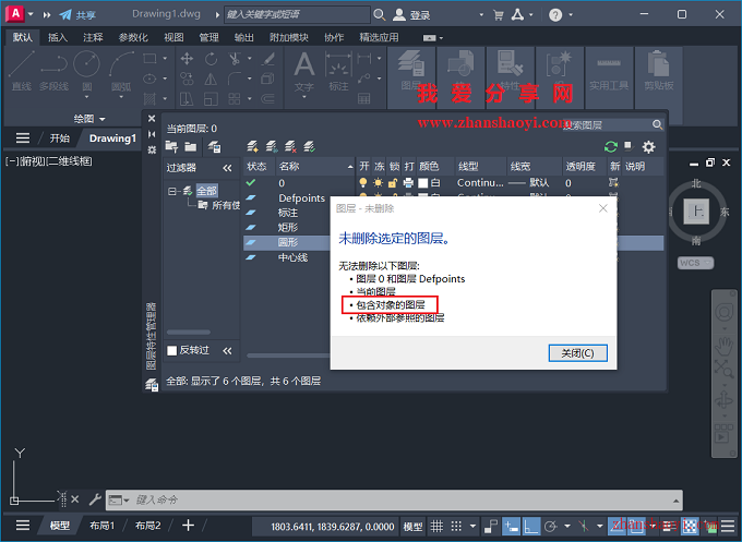在使用CAD绘图时,我们会创建图层来进行图纸设计,有时操作时会产生一些多余图层,为了便利,我们需要将这些多余的图层进行删除;一般在图层特性管理器中,我们选中要删除的图层,鼠标右键找到【删除图层】点击即可,但如果图层上有内容,将弹出一个警告窗口,如下,包含对象的图层不能被删除,应该怎么做呢?