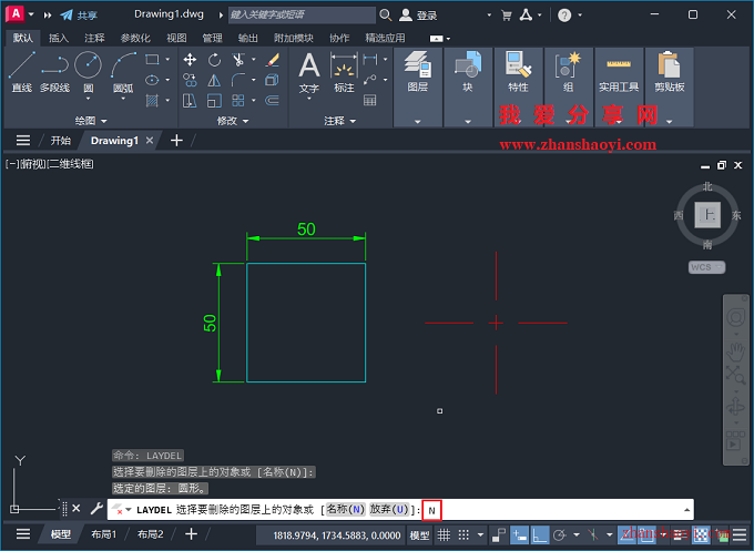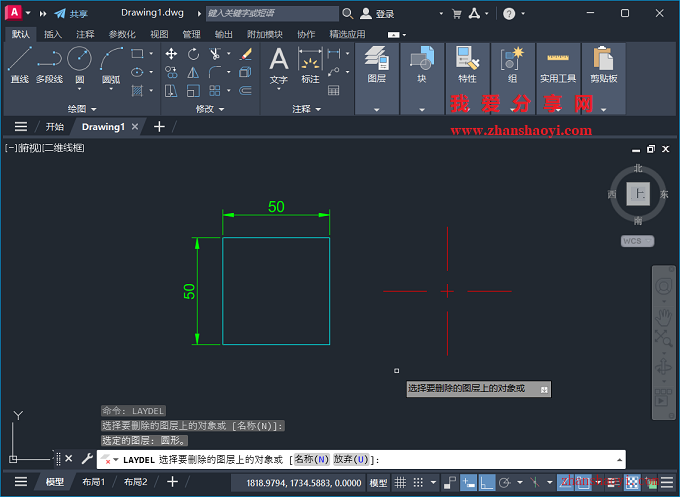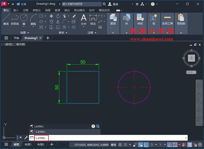 1、先打开AutoCAD 2026软件,绘制如下示例图形,并在下方命令栏中输入;LAYDEL,然后按Enter键;