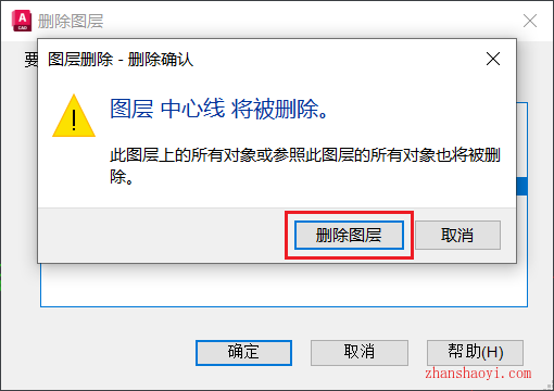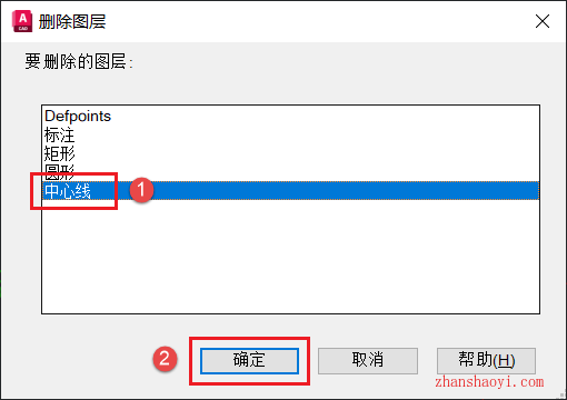 4、弹出删除图层对话框,选中要删除的图层,这里选择中心线图层,然后单击【确定】按钮;注意:细心的小伙伴肯定发现0层不在列表中,其实「LAYDEL」命令不能用来删除0层和当前图层;