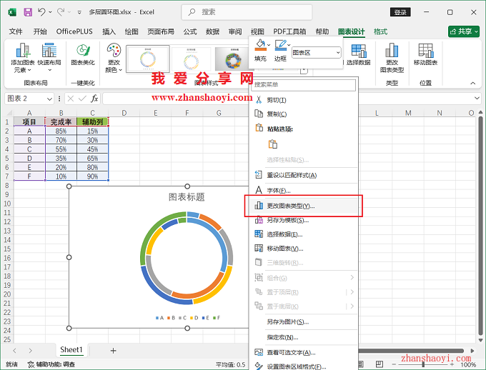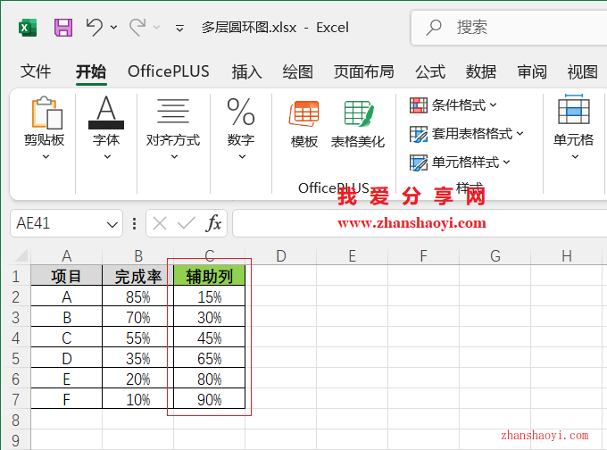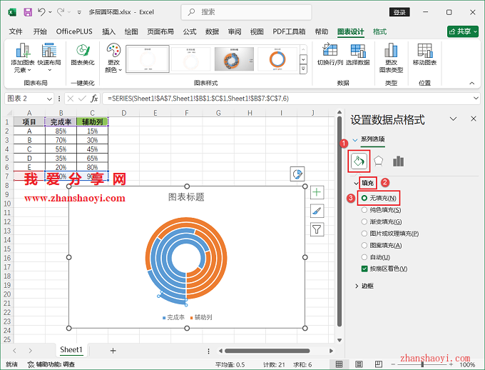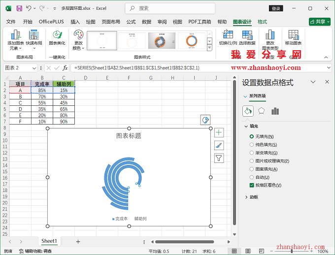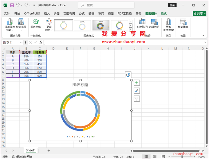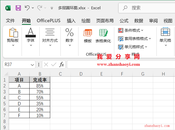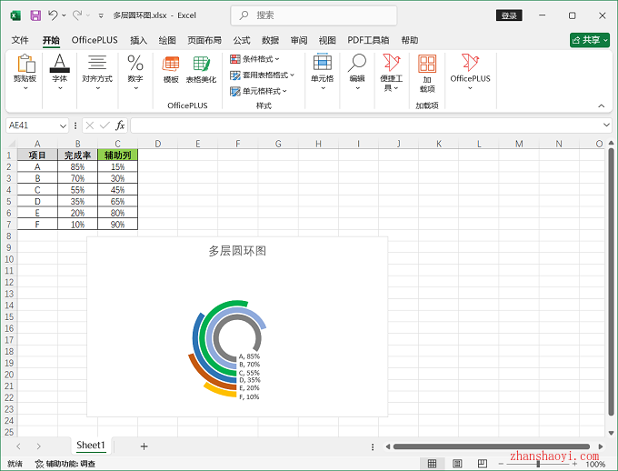 12、最后,修改标题、手动插入文本框添加各项目名称和完成率,完成多层圆环图效果如下,希望本文分享的内容对你有所帮助~~