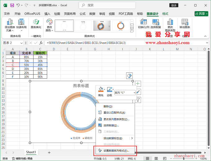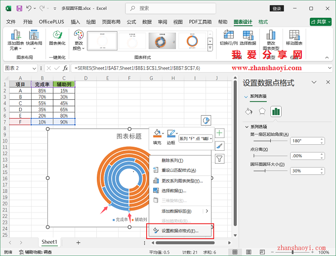 7、在圆环图形上鼠标右击选择【设置数据系列格式】;