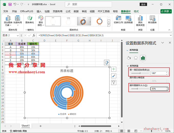 8、第一扇区起始角度调整为180°;圆环图圆环大小设置为30%;