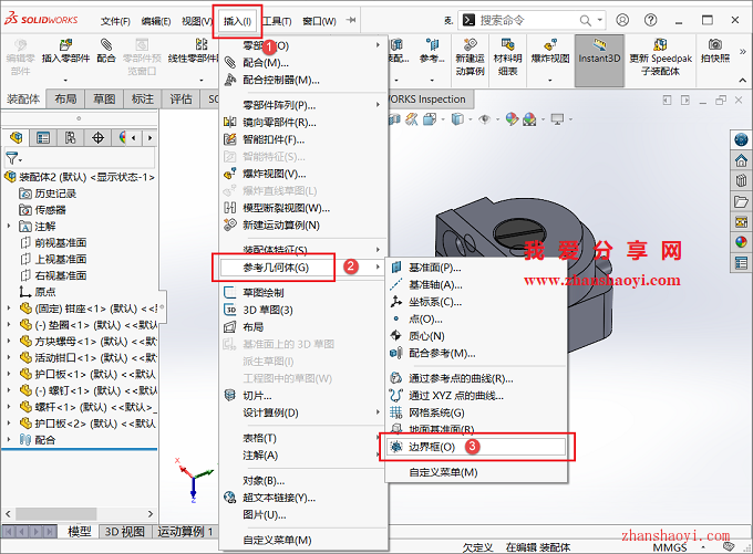 2、将鼠标放到界面左上角的SOLIDWORKS图标处,点击菜单栏中【插入】→【参考几何体】→【边界框(O)】;