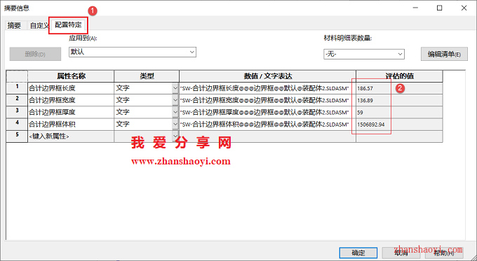 5、点击【配置特定】选项卡,可显示模型的最大轮廓长度/宽度/厚度尺寸,希望本文分享的内容对你有所帮助~~