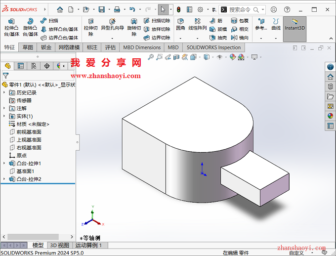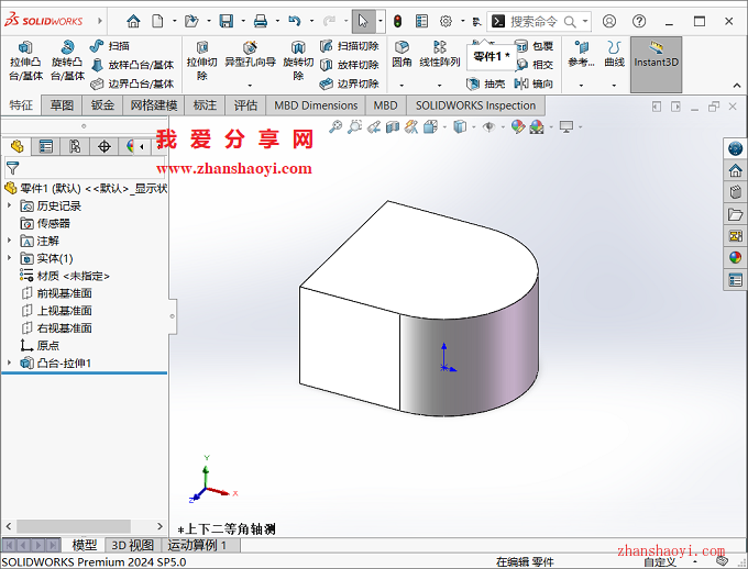 8、如下,SolidWorks在曲面上拉伸实体就完成了,希望本文分享的内容对你有所帮助~~