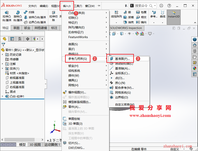 2、第一步,创建新基准面,将鼠标放到界面左上角的SOLIDWORKS图标处,点击上方菜单栏中【插入】→【参考几何体】→【基准面】;