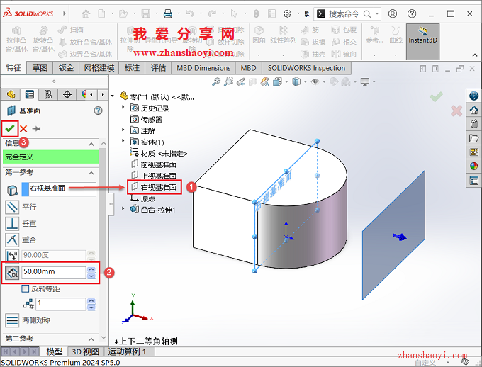 3、因为要在圆弧面要进行拉伸,先点击【右侧基准面】作为第一参考,这里将距离设置为50mm放置新基准面,然后点击左侧【✓】按钮;