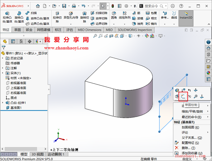 4、在新基准面上鼠标右击选择【草图绘制】按钮;