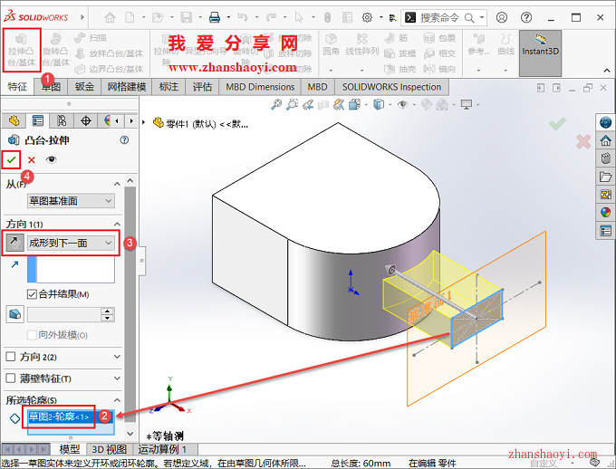 6、第二步,成形到下一面,点击【拉伸凸台/基体】按钮,选择上步新建的草图轮廓,方向1设置为【成形到下一面】,点击【✓】按钮退出;