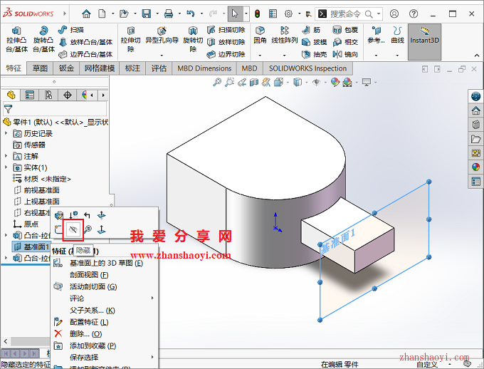 7、第三步,隐藏多余的基准面,鼠标右击左侧设计树中【基准面1】选择【隐藏】按钮;