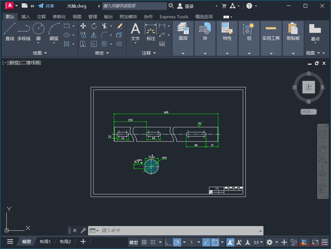1、先打开AutoCAD 2025软件,打开如下示例光轴二维图纸;