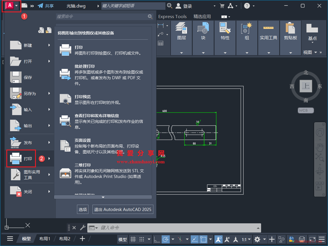 2、点击左上角【CAD图标】→【打印】选项;
