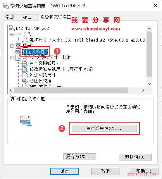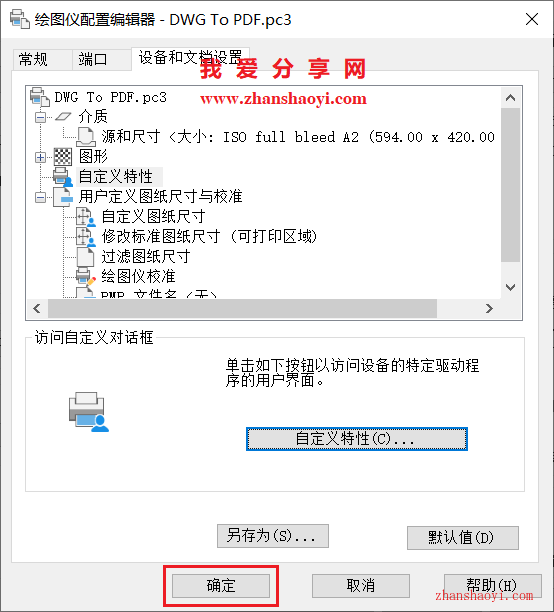 3、打开打印对话框,先选择打印机和图纸尺寸,这里以DWG To PDF.pc3打印机为例,点击【特性】按钮;