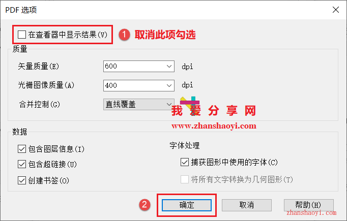 5、打开PDF选项对话框,先取【在查看器中显示结果】前面的勾选,然后点击【确定】;