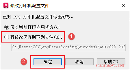 7、弹出修改打印机配置文件对话框,如果需要重新打印PDF图纸时不会再自动打开,勾选第二项,然后点击【确定】;