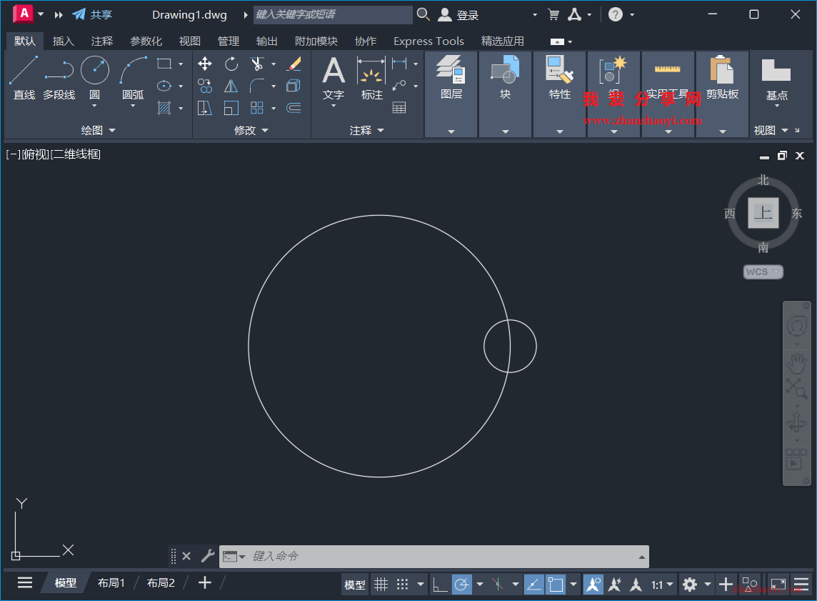 1、先打开AutoCAD 2025软件,进入CAD绘图界面,新建如下两个圆形,其中一个圆形在另一个圆弧上;