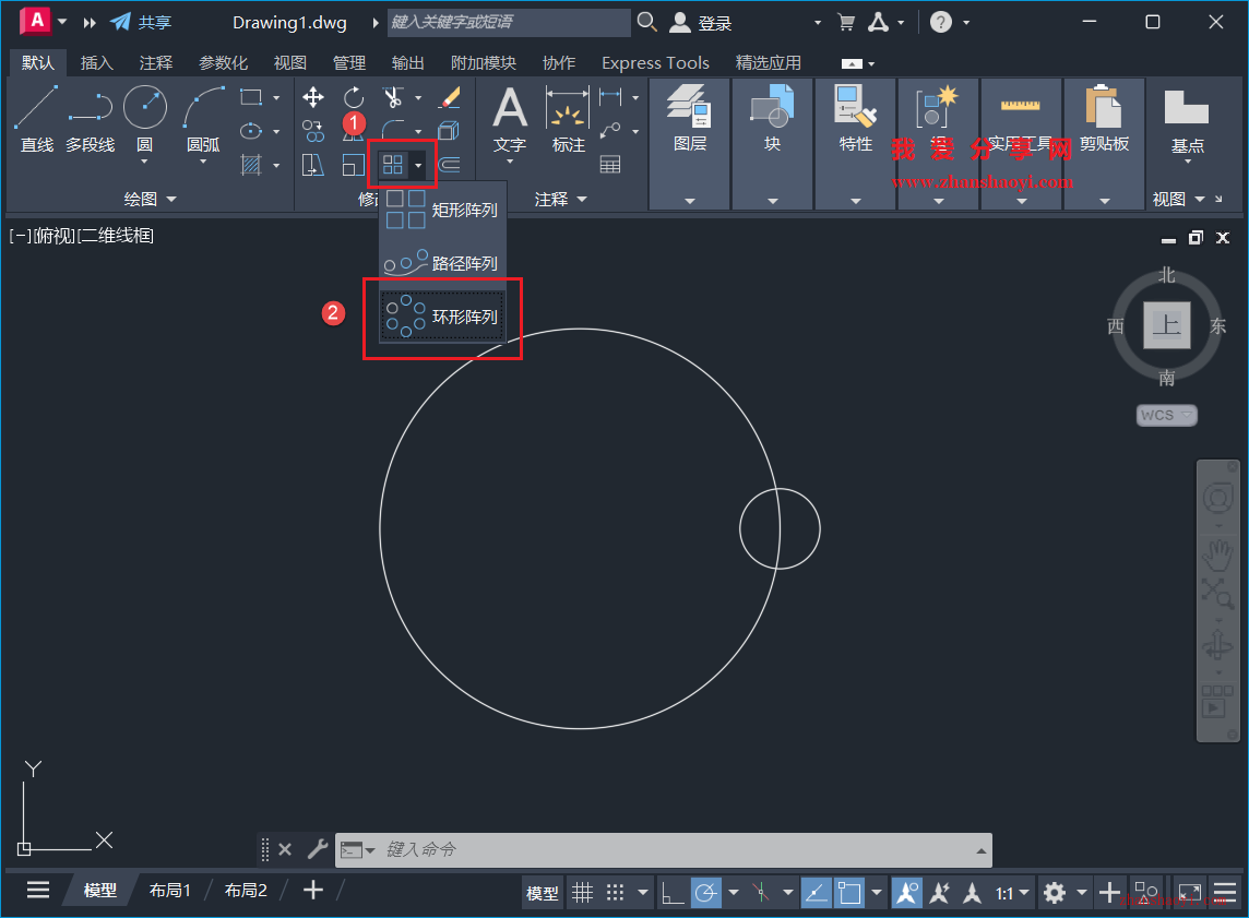 2、点击上方工具栏中【阵列】按钮→【环形阵列】;
