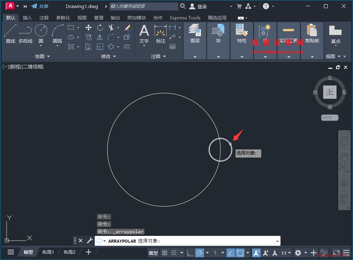 3、提示选择对象,这里单击选择小圆作为阵列对象;