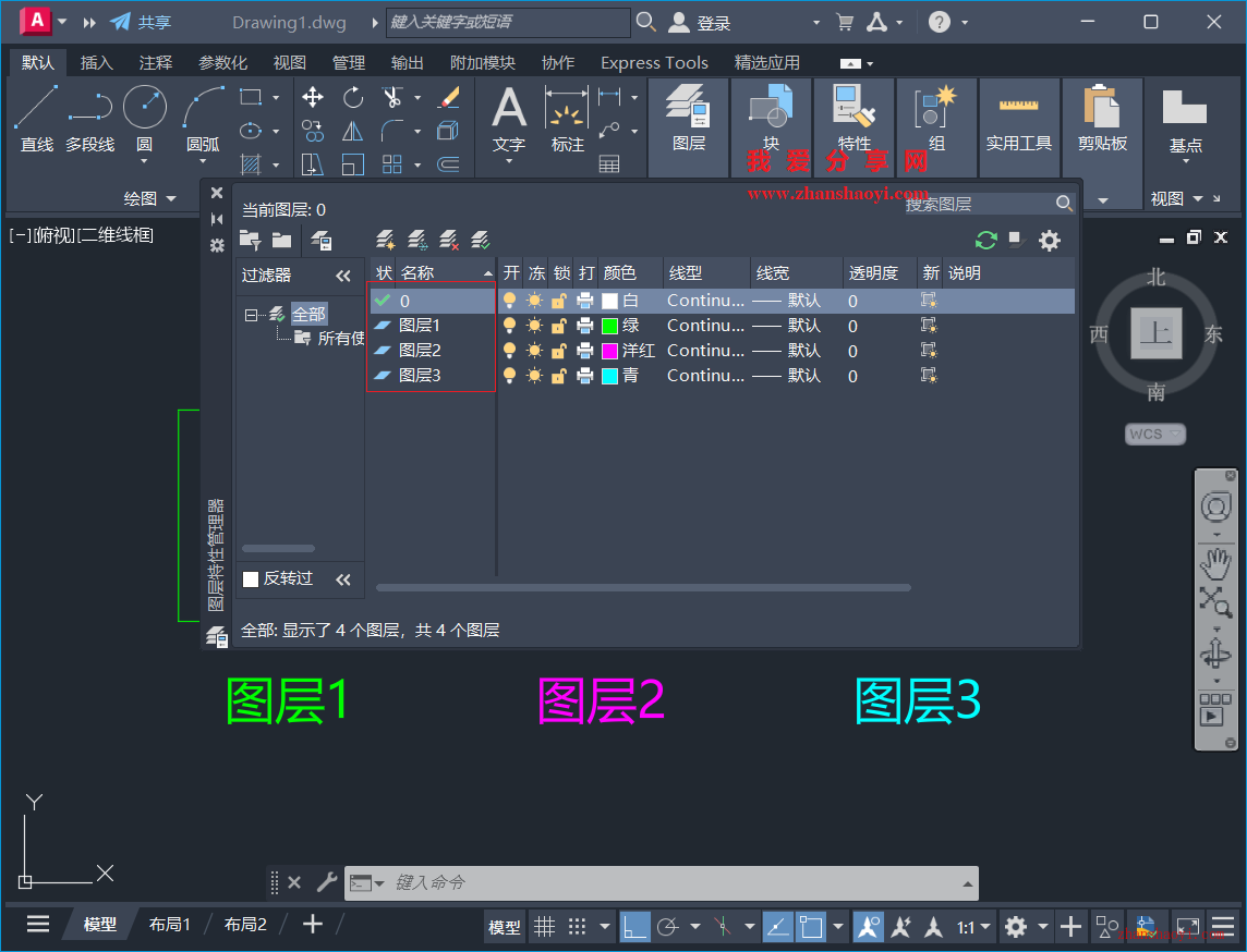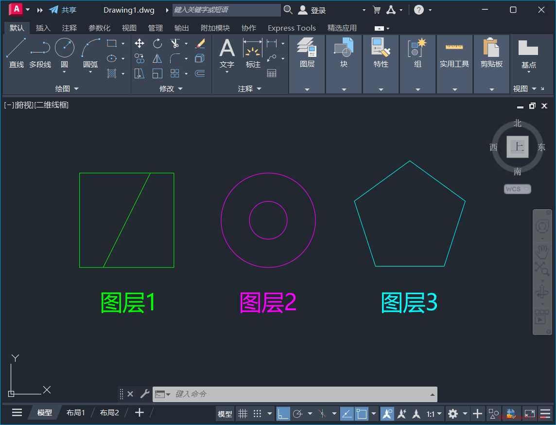 1、先打开AutoCAD 2025软件,进入CAD绘图界面,然后绘制如下示例图形,包含4个图层;