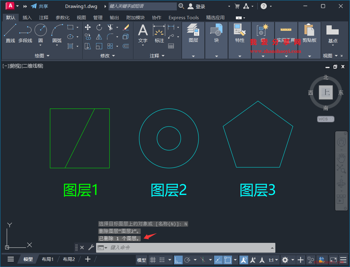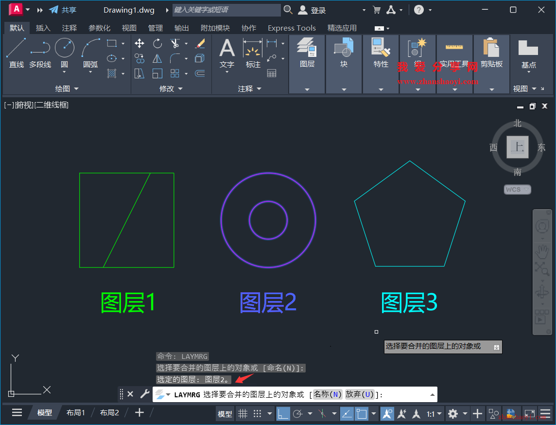 7、如下,图层2上所有图形的颜色已和图层3的颜色保持一致,即图层2与图层3合并完成,即所选定图层上的图形都从原始图层合并到指定的目标图层,希望本文分享的内容对你有所帮助~~