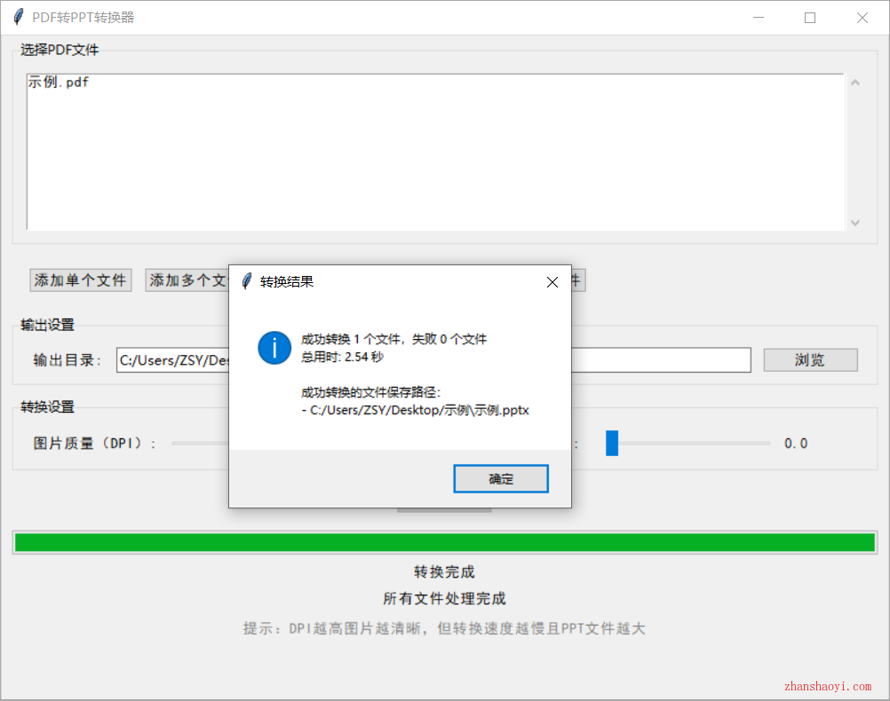 支持单个PDF转换,也支持多个PDF转换,成功转换会弹窗提示;