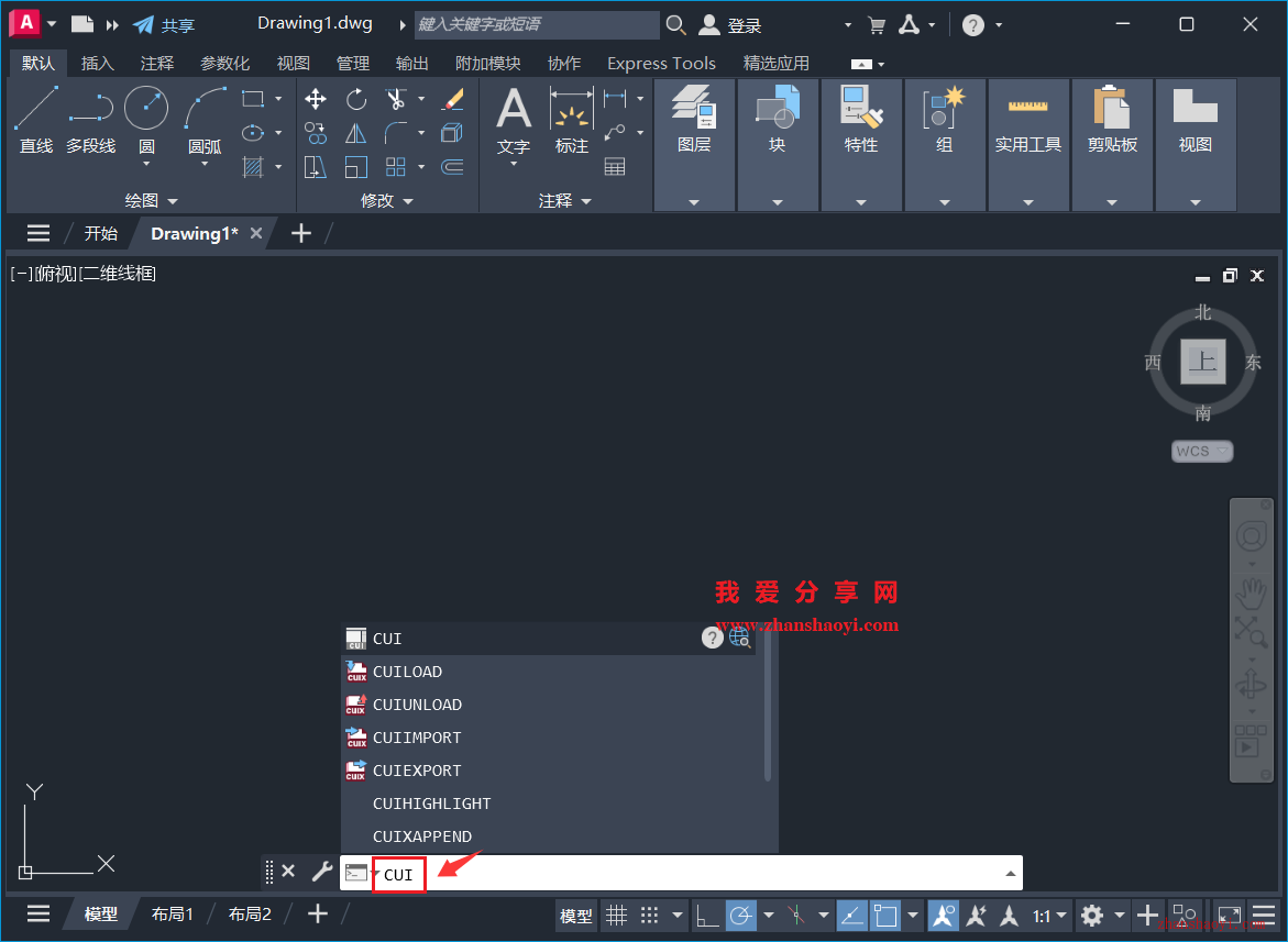 1、先打开AutoCAD 2026软件,进入CAD绘图界面,在下方命令栏中输入:CUI,然后按Enter键;