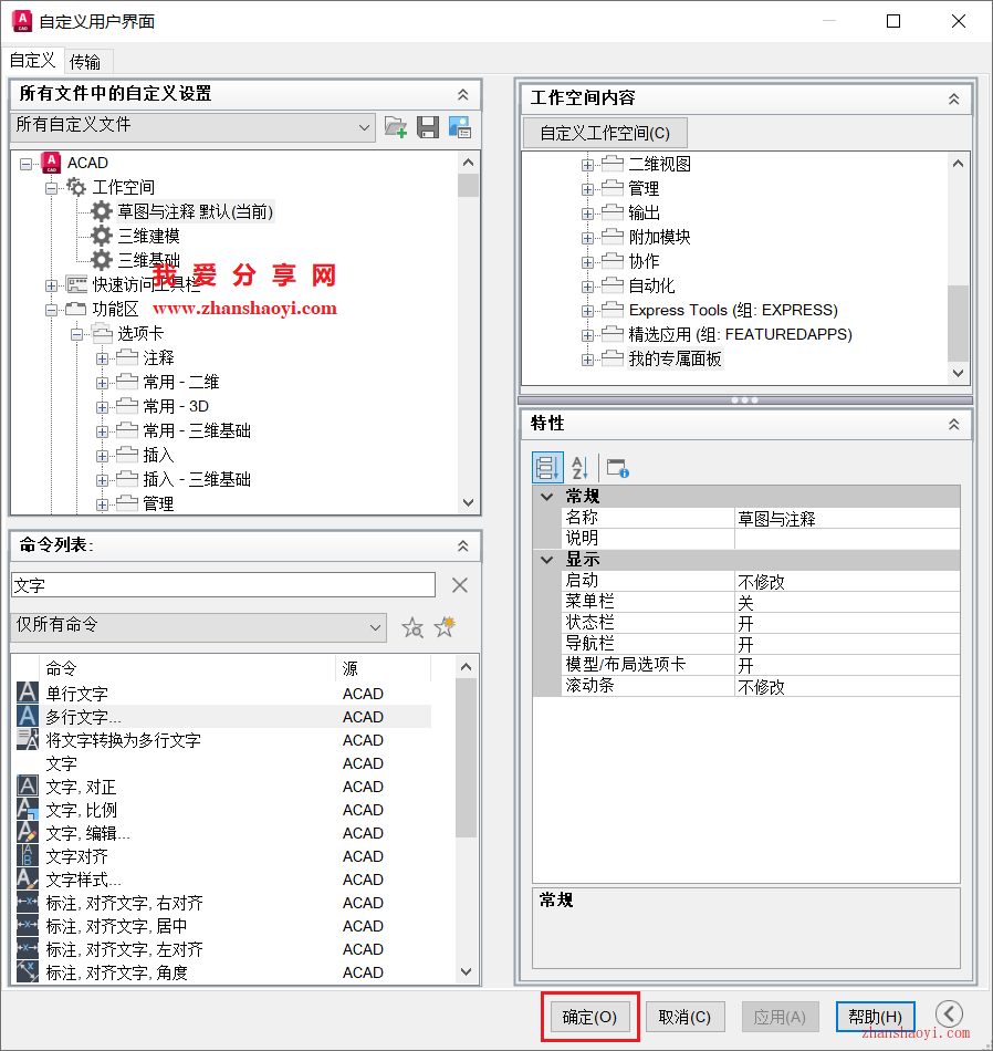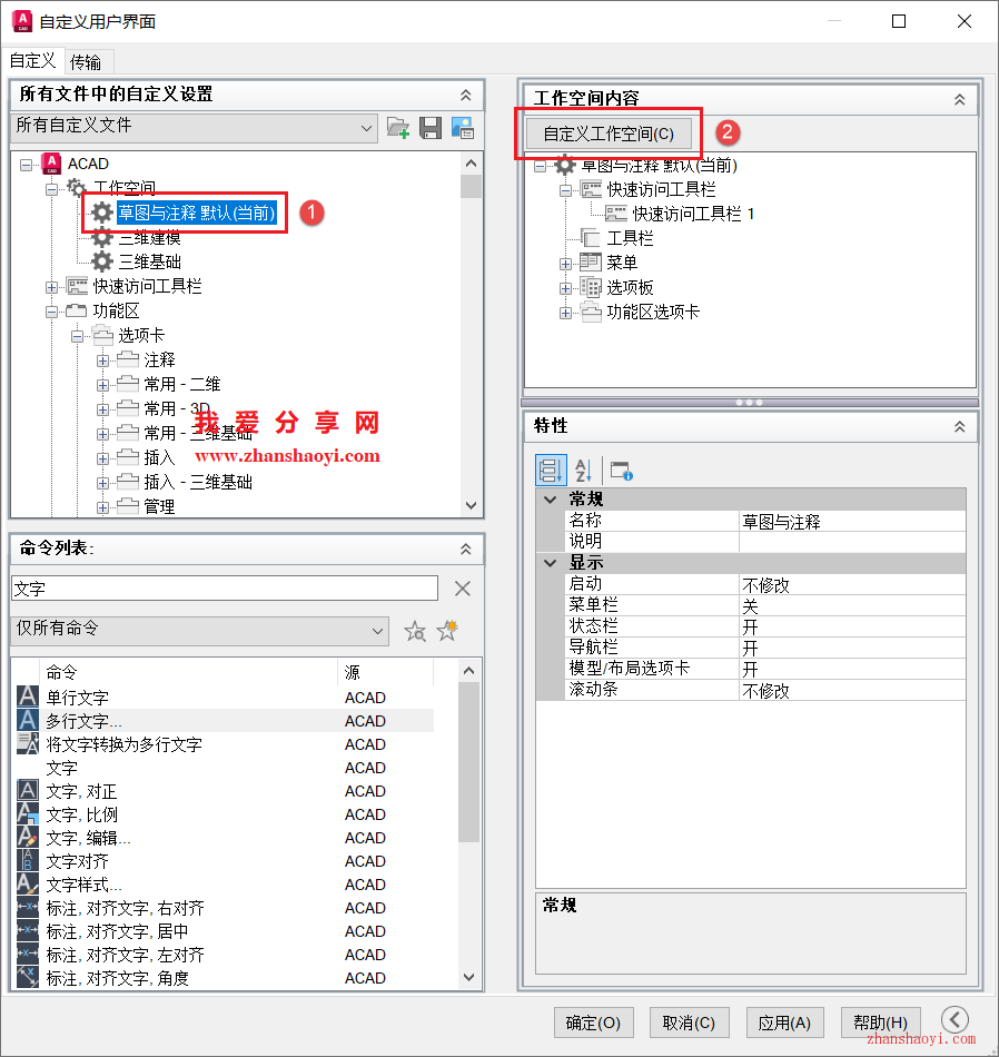 9、找到工作空间栏下「草图与注释默认(当前)」,再点击右侧【自定义工作空间】;