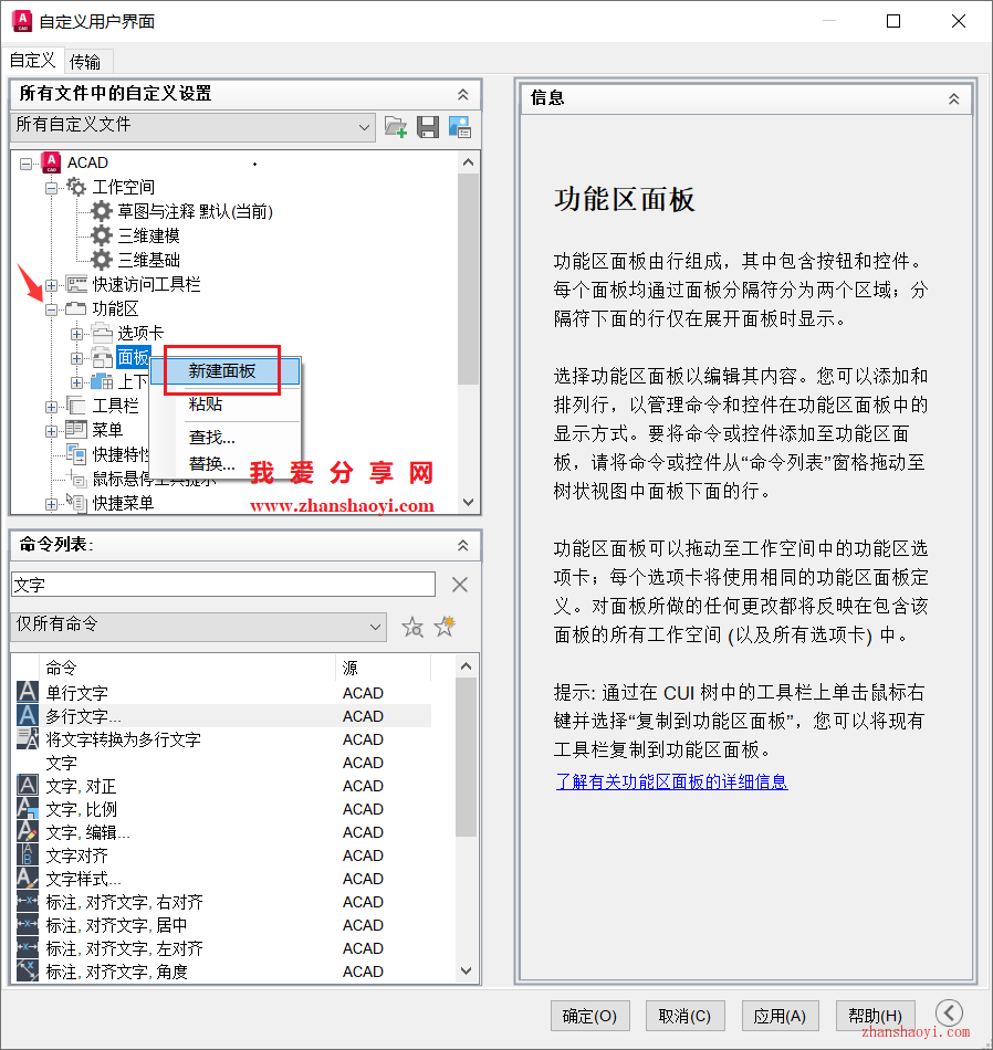 2、调出自定义用户界面,在多级菜单中找到「面板」,鼠标右击面板选择【新建面板】;
