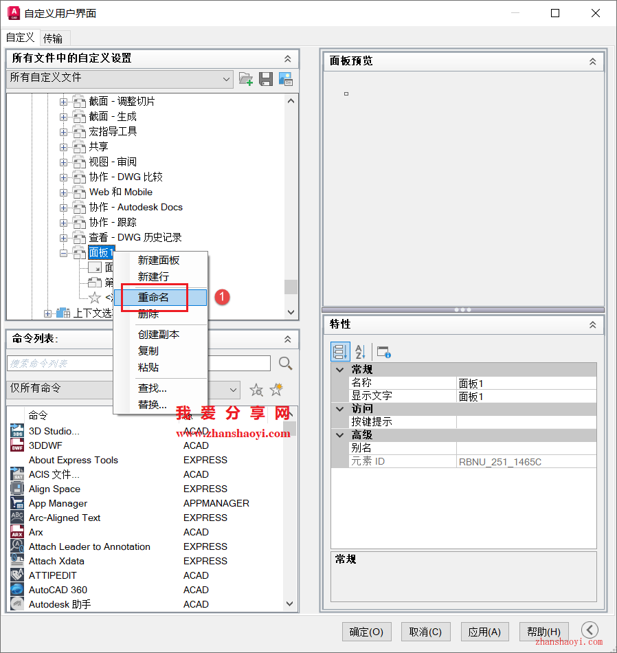 3、默认名为面板1,鼠标右击选择【重命名】修改为自己喜欢的个性名称即可;