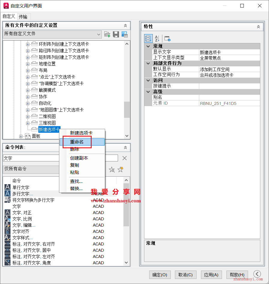 6、默认名为新建选项卡,鼠标右击选择【重命名】修改为我的专属面板;
