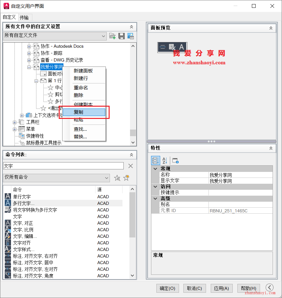 7、找到刚刚自己建的面板(我爱分享网),鼠标右击选择【复制】;