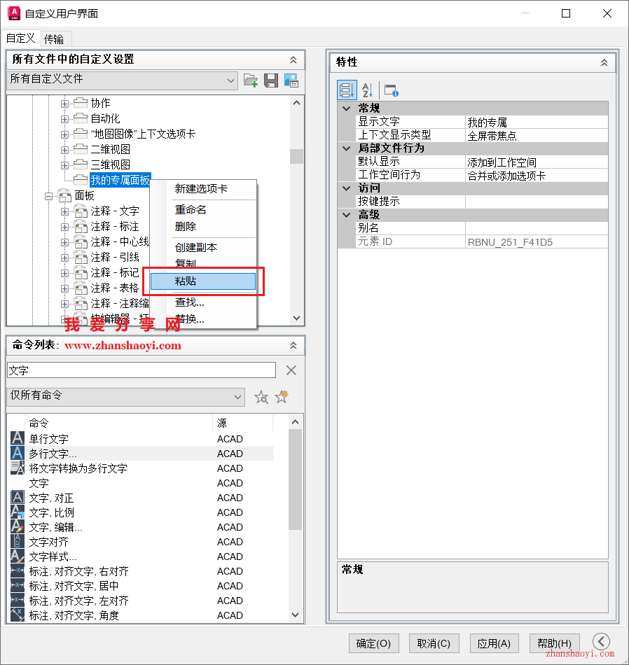 8、找到上步新建的选项卡(我的专属面板),鼠标右击选择【粘贴】,粘贴后如下;